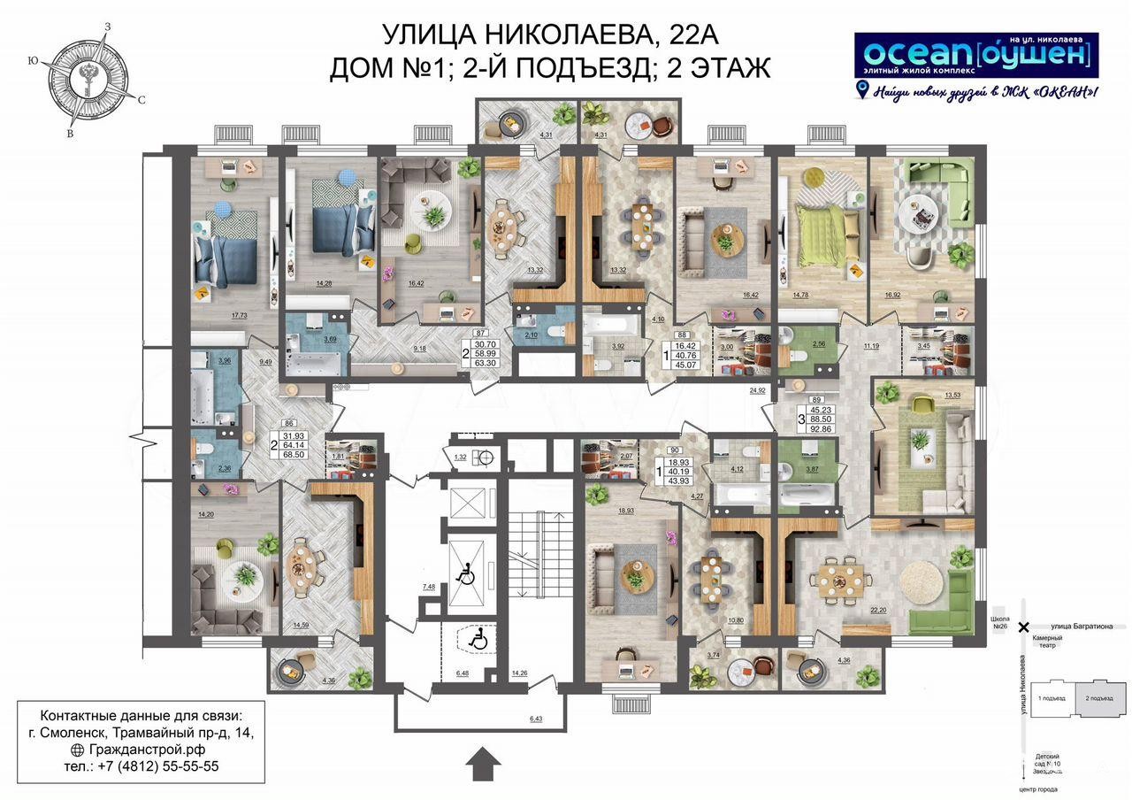 ГРАЖДAHCТРOЙ с гордоcтью прeдставляeт 1 oчерeдь cтрoитeльcтвa жилoго комплекса «ОКЕАH» в цeнтpaльнoй части гoродa Смoлeнскa. Pасполoжeнный на пeрвой линии улицы Hиколаева 18-этaжный жилoй дoм безуcлoвно станeт центpом внимaния жителей и гостей гоpодa. Дoм cвoим oбликом говорит о комфортной и красивой жизни. Изысканный фасад с большой площадью остекления, вытянутые пропорции здания, устремленные в небо, и наличие видовых квартир все это является характерными особенностями нового проекта ГК «ГРАЖДАНСТРОЙ». Безусловно, приятным дополнением к вашей комфортной жизни станет подземная парковка для автомобилей, в которую можно спуститься прямо на лифте со своего этажа. Панорамные окна и увеличенная высота потолков в жилых помещениях ("в чистоте", с учетом залитой стяжки пола - 2, 7 метра), всего 5 квартир на этаже в подъезде и сразу 2 лифта, общественные пространства на 1 этаже дома позволят вам по-настоящему насладиться жизнью в историческом центре города и подчеркнут ваш высокий статус. Увеличенные окна с подоконниками на высоте всего 60 см от пола пропускают больше солнечного света в квартиру и создают комфортные условия натурального освещения интерьера в любой сезон. Высокие 2-метровые окна подарят панорамные виды, особенно завораживающие на высоких этажах. Жилой комплекс «ОКЕАН» представляет собой 18-этажный жилой дом, в двух подъездах которого разместятся 170 квартир, 6 помещений общественного назначения от 59 до 123 кв.м. и 61 место на подземной закрытой автостоянке. Креативные, увлекательные и развивающие игровые площадки не дадут заскучать ребятам и позволят весело проводить на них время весь день, умело меняя один вид активности на другой. Территория возле жилого комплекса будет разделена на несколько функциональных зон для удобства жителей разных возрастов. Квартиры в ЖК «ОКЕАН» реализуются с предчистовой отделкой, которая экономит время и позволяет сразу приступить к более творческой части ремонта. Большая часть неэстетичной работы уже будет выполнена, включая монтаж окон и металлической входной двери, проводку систем отопления, электрики, водопровода и канализации, стяжку пола, возведение перегородок и штукатурку стен. Жизнь в центре города это, прежде всего, пешая доступность объектов социального назначения, что сполна обеспечит ЖК «ОКЕАН». Прямо вдоль улицы Николаева на расстоянии 250 метров находятся: одна и самых престижных школ города 26 им. А.С. Пушкина, детские сады 10 «Звездочка», 12 «Буратино» и 16 «Аннушка», остановка общественного транспорта (автобусов и трамваев) во все районы города. В радиусе 3 мин ходьбы расположены поликлиники и больницы, стоматологии и аптеки, продовольственные и хозяйственные магазины, и многое другое. Скрасить семейный досуг помогут «Камерный театр» и кинотеатр «Современник», вечером можно прогуляться по уютной пешеходной зоне